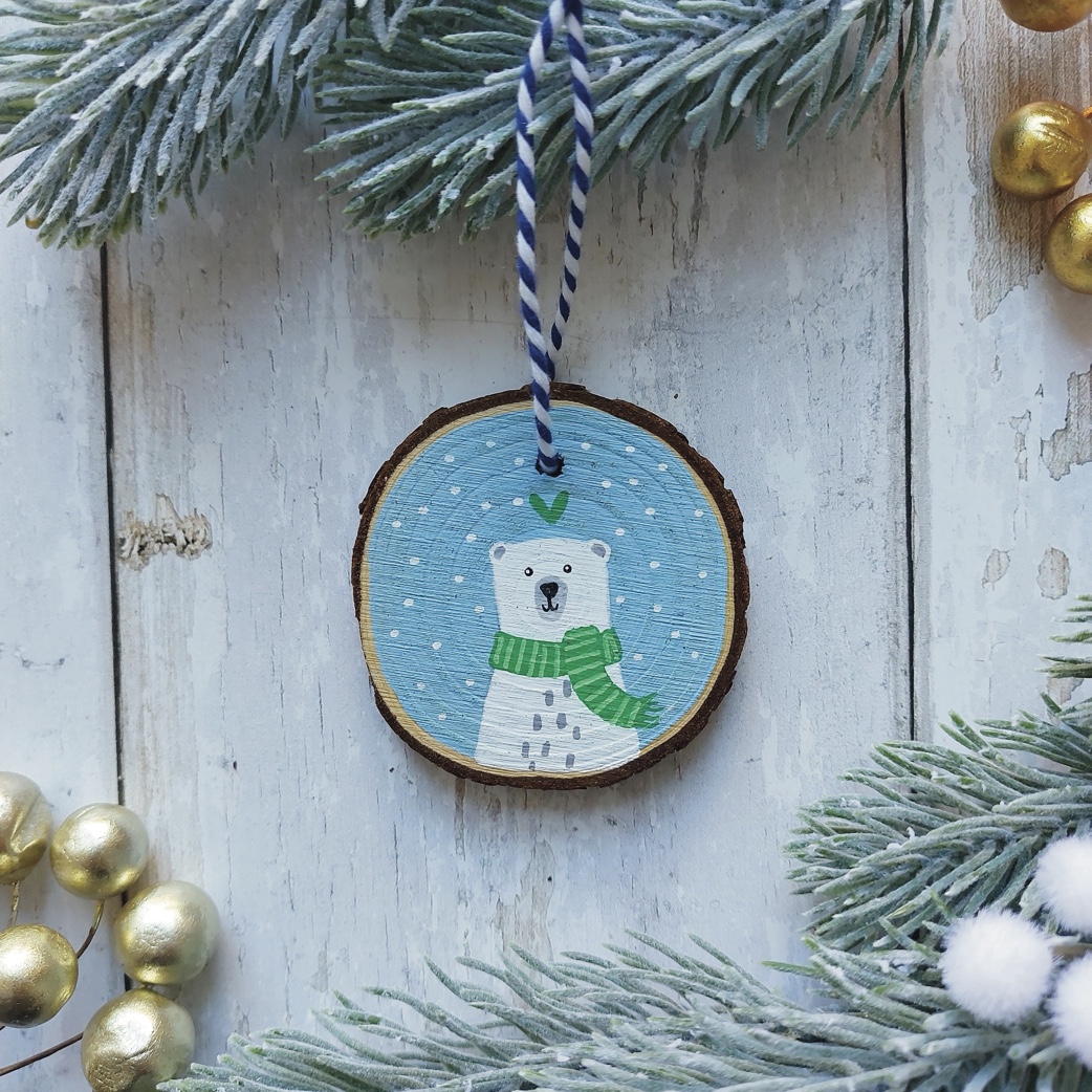 - Little polar bear design on a natural wood slice, perfect for a special gift